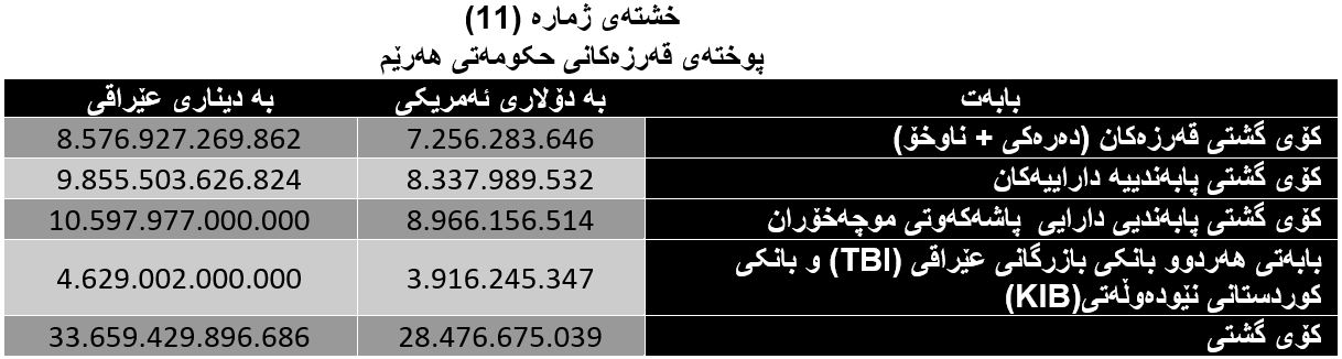 لەم خشتەیەی خوارەوەدا پوختەی قەرازەکانی سەر حکومەتی هەرێم ڕونکراوەتەوە پێش بڕیاری پاشەکەوت کردنی موچەی مانگەکانی (5، 6، 7، 8، 12،11ی ساڵی 2020)ی فەرمانبەرانی هەرێمی کوردستان.