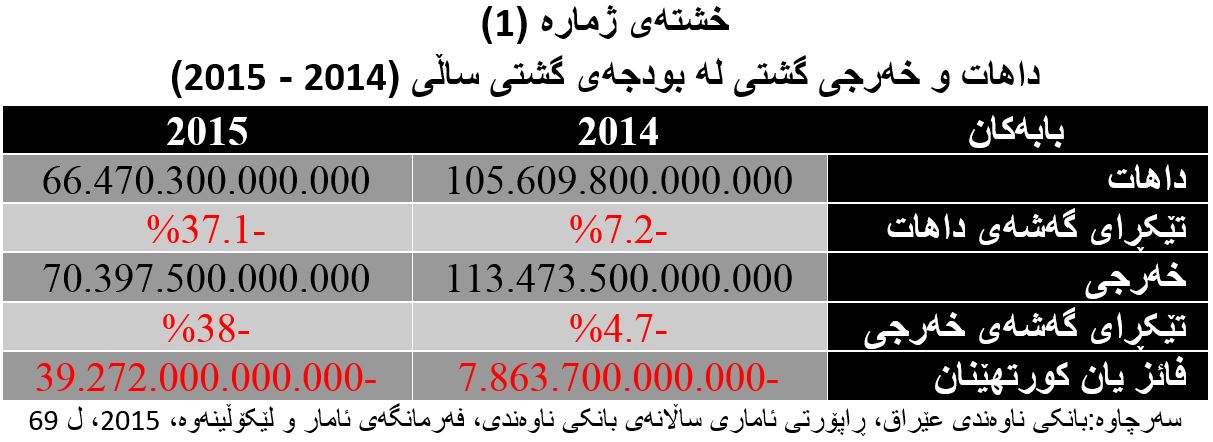 بە کوردتی بودجەی گشتی وڵات لەو ساڵەدا توشی کورتهێنانی گەورە بوویەوە لە ڕووی داهاتەوە کە داهاتی گشتی (39 ترلیۆن و 100 ملیار) دینار و بەڕێژەی (37.1%) لە ساڵی (2015) کەمتربوو بەراورد بە ساڵی (2014)، چونکە داهاتی ساڵی (2015) بڕی (105 ترلیۆن و 609 ملیار) دینار بووە، لە کاتێکدا ساڵی (2014) بە (66 ترلیۆن 470 ملیار) دینار تۆمار کراوە. (بڕوانە خشتەی ژمارە (1))
