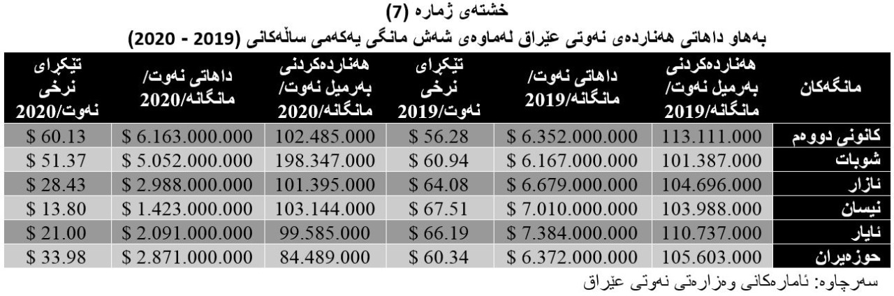 لەگەڵ ئەوەی بۆ ماوەی چەند ساڵێک نرخی نەوت لە بازاڕەکانی جیهان جۆرێک لە سەقامگیری بەخۆوە بینی بوو بەڵام بەهۆی سەرهەڵدانی ڤایرۆسی کۆرۆناو کەمبوونەوەی خواست لەسەر کڕینی نەوت لە بازاڕەکانی جیهان، لەگەڵ دەستپێکی ساڵی نوێ (2020) نرخی نەوت جارێکی دیکە داڕومانی گەورەی بەخۆوە بینی و وڵاتانی هەناردەکاری نەوتی خستە شوکێکی نوێوە، حکومەتی عێراقیش بێ بەش نەبووە لەم گورزە لەناکاوە، ئەو خشتانەی خوارەوە (7 و 8) ئەو قەیرانە گەورەیە ڕووندەکاتەوە کە داهاتی نەوتی عێراق بۆ چی ئاستێک دابەزیوە؟ کاتێک بەراوردی داهاتی شەش مانگی یەکەمی ساڵی (2020) بەراورد دەکەی بە شەش مانگی ساڵێک پێشتر.