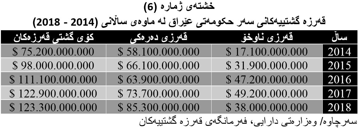 لەگەڵ کورتهێنانی زیاتری بودجەی گشتی قەرزی گشتی بە هەردوو جۆری (ناوخۆیی و دەرەکی) ڕووی لە بەرزبوونەوە کردووە لە ساڵی (2014) کۆی قەرزەکانی سەر عێراق (75 ملیار و 200 ملیۆن) دۆلار تا ساڵی (2018) گەیشتووە بە (123 ملیار و 300 ملیۆن) دۆلار، بڕوانە خشتەی ژمارە (6)