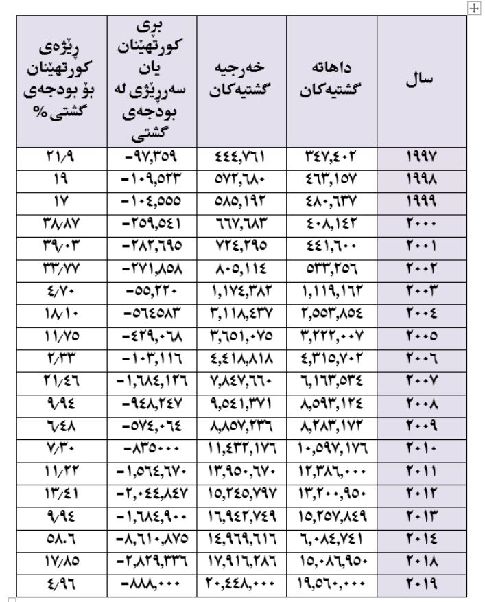 خشتهی ژماره (1) نیشانى ئهدات كه لهماوهی (23) ساڵی ڕابوردودا ههمیشه خهرجیه گشتیهكان لهداهاته گشتیهكان زیاتر بون و دۆخی دارایی گشتی له ههرێم له كورتهێنانی بهردهوامدا بوه، زیادبونی گهورهی قهبارهی داهاتهكان له ههندێ ساڵدا (بههۆكارهكانی كۆتایی گهمارۆ ئابوریهكان و بهرزبونهوهی نرخی نهوت و سودمهندبونی ههرێم لهبودجهی عێراق) نهیتوانیوه كۆتایی به كێشهی كورتهێنان بهێنێت، چونكه ههمیشه ڕێژەی ههڵكشان و زیادبونی داهاتهكان كهمتر بوه لهڕێژەی ههڵكشانی خهرجیهكان، كهمبونهوهی قهبارهو ڕیژەی كورتهێنان لهههندێ ساڵدا لهسهر بنهمایهكی ئابوريى نادروست بوهو بهشێكی لهسهر حیسابی لهقاڵبدانی خهرجیه گشتیه گرنگ و پێویستهكان بوه بهتایبهتیش لهبواری وهبهرهێنان و پرۆژەكان، واته لهسهر حیسابی هاوسهنگی ئابووری بوه، تاكو ساڵی2013 زۆربهی كورتهێنانهكانی بودجهی خهمڵێنراو لهڕێگهی جێبهجێنهكردنی بهشیك له تهرخانكراوهكانی بودجهی وهبهرهێنانهوه پڕكراونهتهوه، (گوڵپی،2020 ،43-44).
