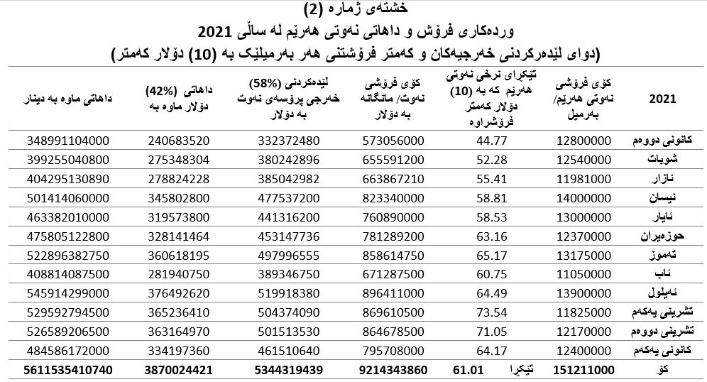 سەبارەت بە كۆی گشتی فرۆشو داهاتی نەوتی هەرێم لە ساڵی (2021)دا، حكومەتی هەرێمی كوردستان (151 ملیۆنو 211 هەزار) بەرمیل نەوتی هەناردە كردووە، تێكڕای نرخی نەوت لە ساڵەكەدا بریتی بووە لە (70.68) دۆلاری ئەمریكی (بڕوانە خشتەی ژمارە (1)).