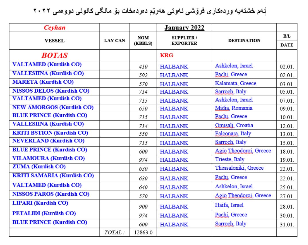 • هەرێمی کوردستان لە مانگی کانونی دووەمی (2022)دا بڕی (12 ملیۆن و 863 هەزار) بەرمیل نەوتی هەناردەکردوە لە ڕێگای بەندەری جیهانی تورکیاوە.