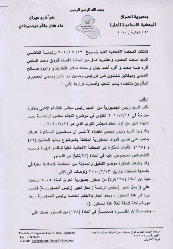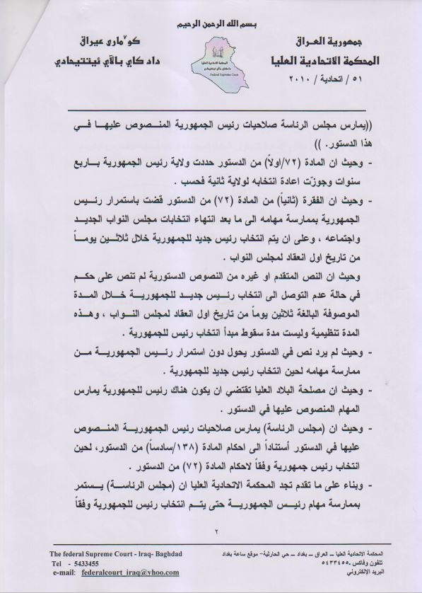 دادگای فیدراڵی ساڵی 2010 حوكمێكی دەركردووە كە وەڵامی دۆخێكی وەكو ئەوەی ئێستا دەداتەوە، دادگا دەڵێ ئەو وادەی (30) رۆژەی دوای كۆبونەوەی یەكەمی پەرلەمان بۆ هەڵبژاردنی سەرۆك كۆمار دیاریكراوە، وادەیەكە "بۆ رێكخستنی پرۆسەی هەڵبژاردنی سەرۆك كۆمارە، نەك بۆ خستنی پرۆسەی هەڵبژاردنی سەرۆك كۆمار".