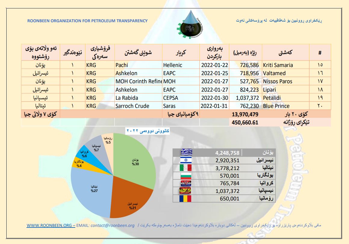 لەمانگی كانونی دووەمی رابردوودا هەرێمی كوردستان نزیكەی (14 ملیۆن ) بەرمیل نەوتی باركراوە كە بەتێكڕا رۆژانە دەكاتە ( 450 هەزار) بەرمیل، (30%)ی نەوتەكەی بە پۆنان و (21%)ی نەوتەكەی بە ئیسرائیل فرۆشتووە.