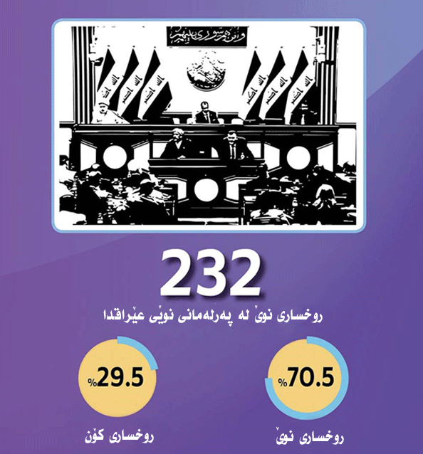 لە كۆی (329) كورسی لە خولی نوێی پەرلەمانی عێراق (232) كورسییان ئەو پەرلەمانتارانە لەسەریان دادەنیشن كە روخساری نوێن و پێشتر ئەندامی پەرلەمان نەبوون.
