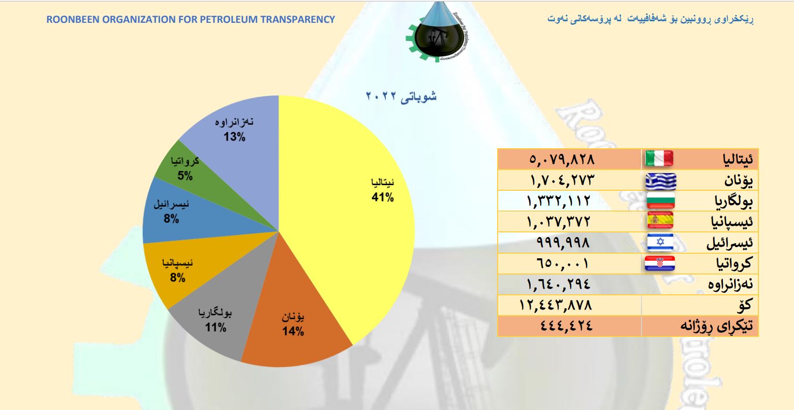 بەپێێ ڕاپۆرتەکەی ڕێکخراوی ڕوونبین بۆ شەفافییەت لە پرۆسەکانی نەوت لەمانگی شوباتدا نەوتی بارکراوی هەرێم لە بەندەری جیهانەوە لە رێی ١٨ کەشتی قەبارە جیاوە بارکراوە کە لانی کەم بۆ ٦ وڵاتی جیا ڕۆشتووە. هەروەها ئاراستەی دوو کەشتی تائێستا بۆ ئێمە نەزانراو.