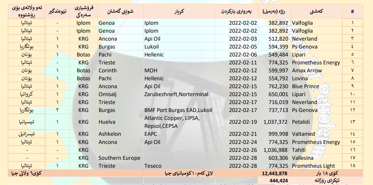 هەرێمی كوردستان لە مانگی شوباتی رابردوودا رۆژانە (444 هەزار) بەرمیل نەوتی فرۆشتووە، لە بەندەری جیهانەوە بە (18) كەشتی بۆ (6) وڵاتی جیا رۆیشتووە.
