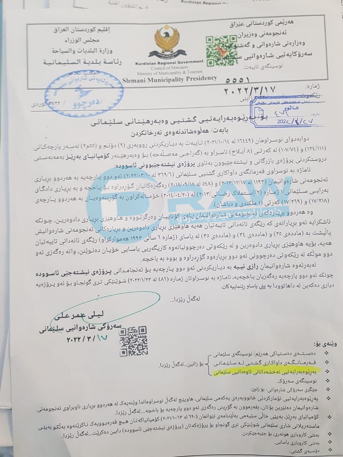 بەپێی نوسراوێك سەرۆكی شارەوانی سلێمانی كە كۆپییەكی دەست (درەو) كەوتووە، شارەوانی بڕیاری راگرتنی دروستكردنی پرۆژەیەكی نیشتەجێبوونی لەشوێنی (گەراجی مەسڵەحەی كۆن) راگرتووە.