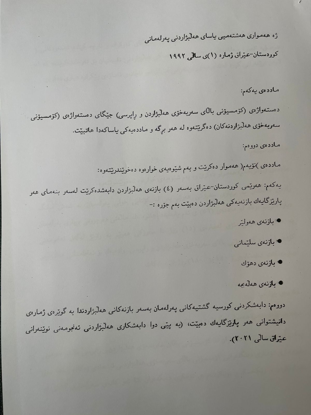 پرۆژەیەك بۆ هەمواری یاسای هەڵبژاردنی پەرلەمانی كوردستان ئامادە كراوە، فراكسیۆنەكانی یەكێتی، یەكگرتوو، كۆمەڵی دادگەرییو جوڵانەوەی نەوەی نوێو دوو پەرلەمانتاری گۆڕان ئیمزایان لەسەر پرۆژەكە كردووە.