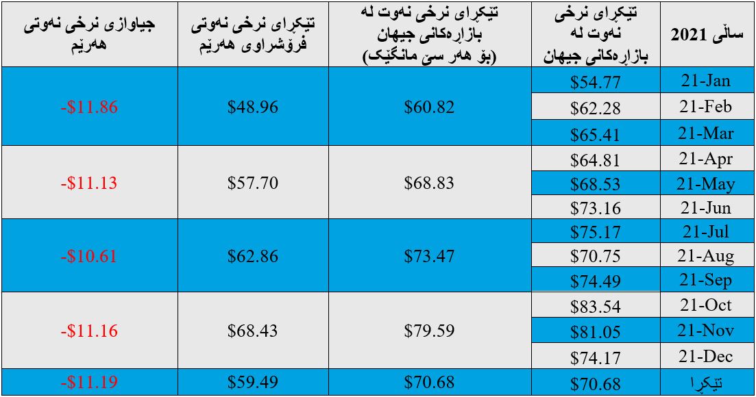 بەپێی داتاکانی دیلۆیت نەوتی هەرێمی كوردستان بەردەوام (11 - 12) دۆلار لە خوار نرخی نەوت لە بازاڕەکانی جیهان دەفرۆشرێت