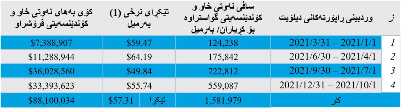 - بەرهەمی نەوت و هەناردە و بەکاربردن و داهات لە ماوەی ١ی کانونی دووەمی ٢٠٢١ تاکو ٣١ی ئاداری ٢٠٢١؛