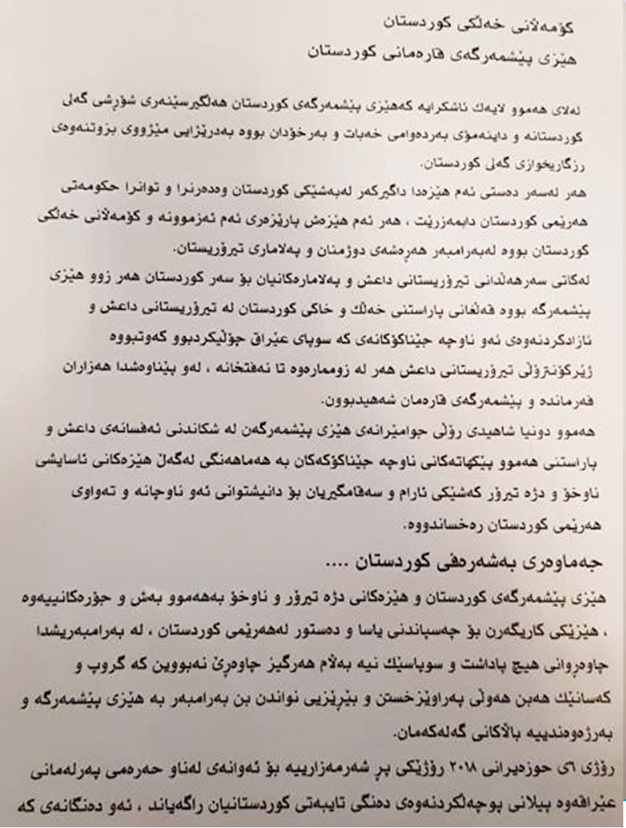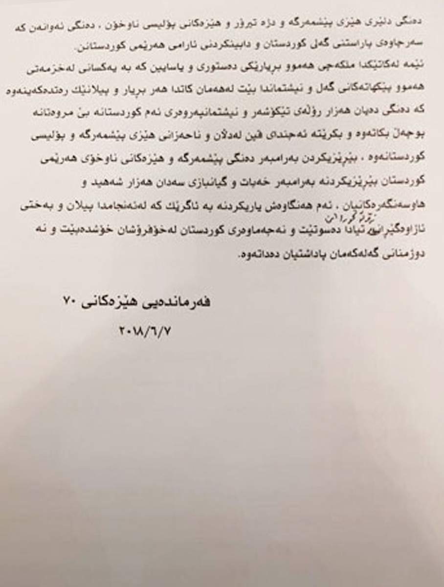 دەقی بەیاننامەكەی فەرماندەیی هێزەكانی 70