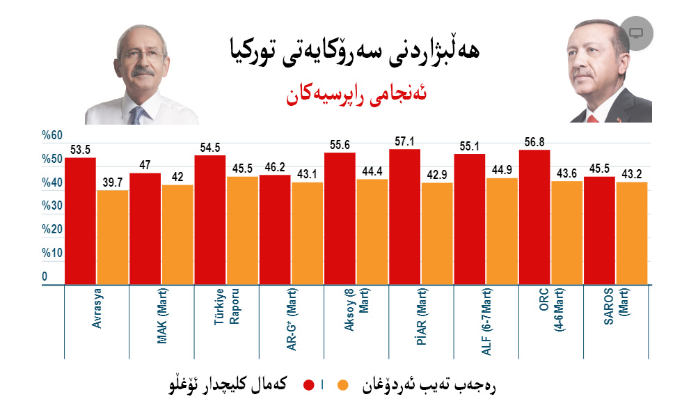 بە گوێرەی (9) راپرسی كە لە توركیا ئەنجامداراوە، رەجەب تەیب ئەردۆغان لە هەڵبژاردنی سەرۆكایەتی توركیا شكست دەهێنێت، لە دواین ڕاپرسیدا كە كۆمپانیایەكی توركی ڕۆژی (14)ی ئەم مانگە ئەنجامیداوە, هەڵبژاردنی سەرۆكایەتی توركیا دەچێتە خولی دووەم, كەمال قڵیچدار ئۆغلۆ 46.2%ی دەنگەكان و ڕەجەب تەیب ئەردۆغان ڕێژەی 43.1% دەنگەكان بەدەستدەهێنێت, بەپێی لێكۆڵینەوەیەكی بنكۆڵكاریش كە لەومایەوەدا بڵاوبوتەوە ئەوە ئاشكرادەكات, كەمال قڵیچدار ئۆغلۆ بە (9) خاڵ لەپێش ڕەجەب تەیب ئەردۆغانەوەیە, بەپێی لێكۆڵینەوەكە ڕێژەی دەنگەكانی قڵیچدار ئۆغلۆ 54.5% و ڕێژەی دەنگەكانی ڕەجەب تەیب ئەردۆغان 45.5%.