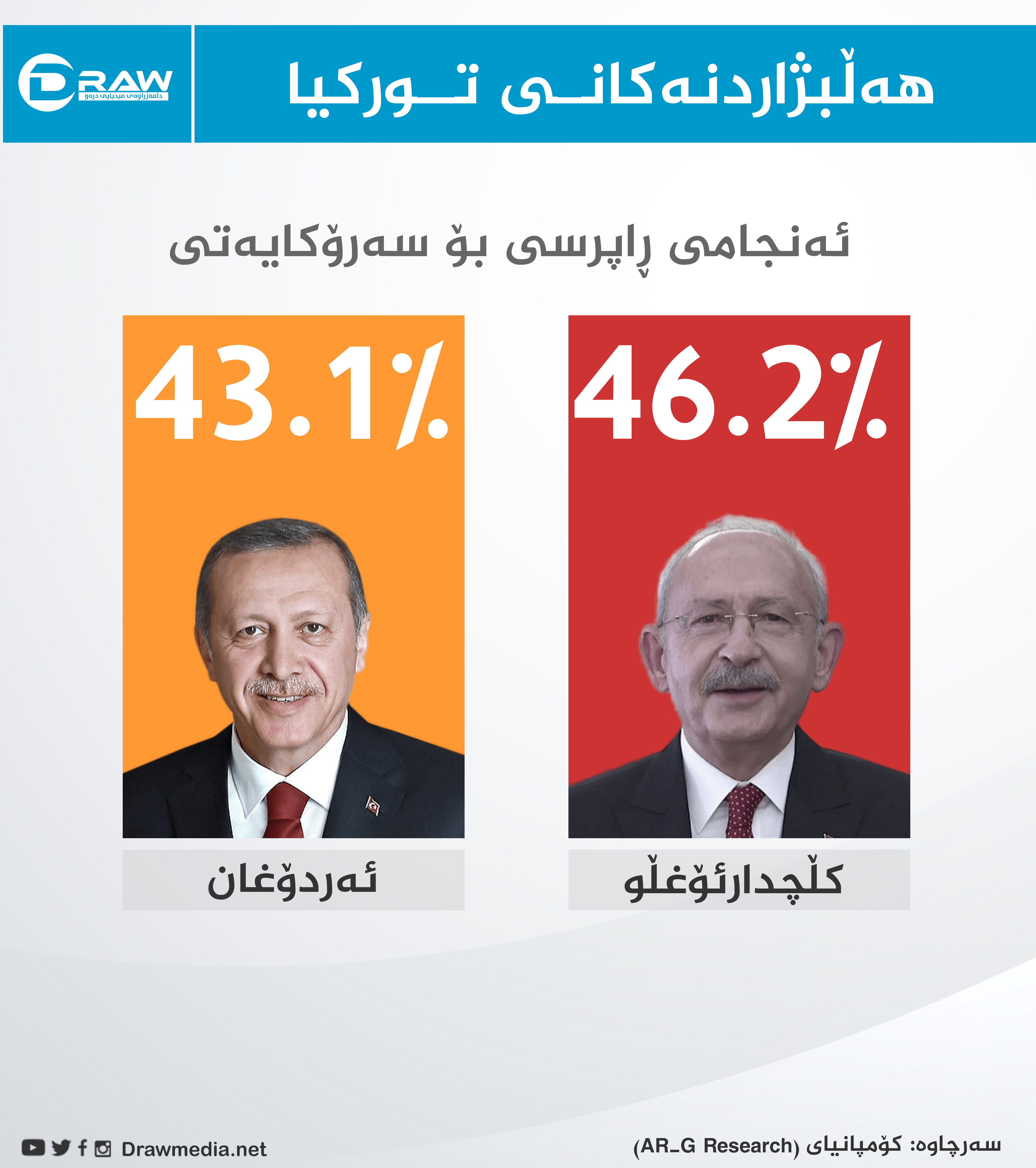 كۆمپانیای (AR-G): كەمال قڵیچدار ئۆغلۆ 46.2%-ڕەجەب تەیب ئەردۆغان 43.1%