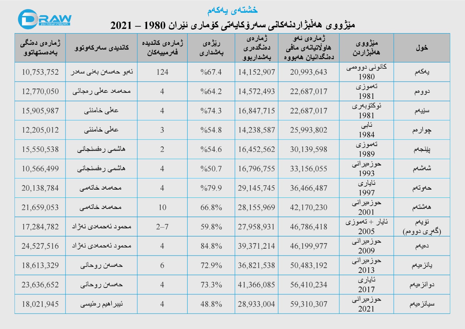 ئێران سیانزە خولی هەڵبژاردنی تەواو کردووە و بەرەو چوادەیەمین خۆل هەنگاو دەنێت، نوخبەی سیاسی وڵاتەکە لە تاقیکردنەوەیەکی سەختتردا لە بەردەم دەنگدەرێکی ئێرانی کە دڵخۆشکردنی ئاسان نییە، ئەزموون و تاقیکردنەوە دەکەن. ڕەنگە دابەزینی ڕێژەی دەنگدان ئاماژەیەک بێت بۆ هەڵوێستی ئەم دەنگدەرانە بەرامبەر بە حکومەتە یەک لە دوای یەکەکانی ئێران.