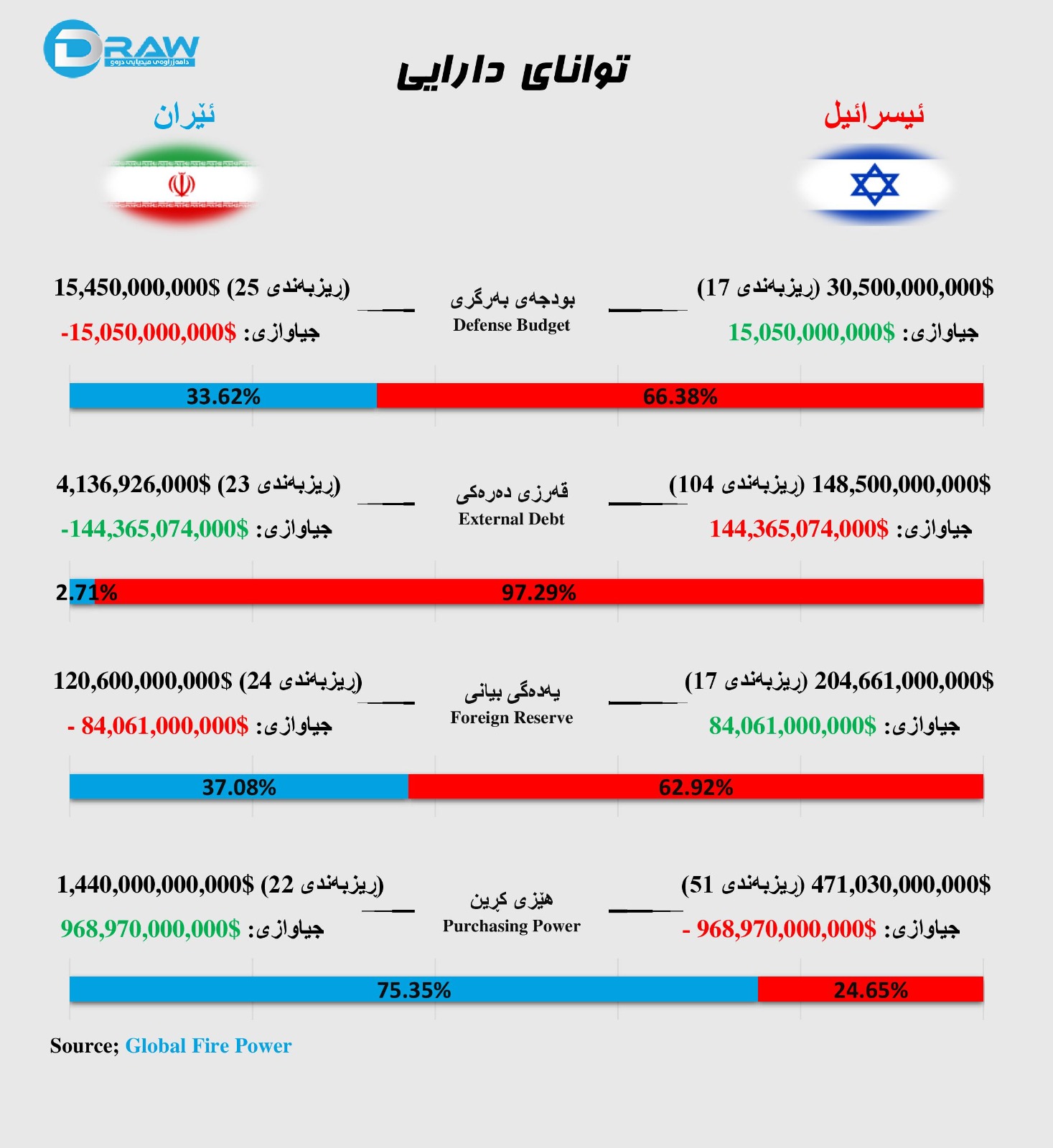 لەچەند ڕوویەکەوە هەریەک لە ئێران و ئیسرائیل توانای دارایی جیاوازیان هەیە بەجۆرێک؛