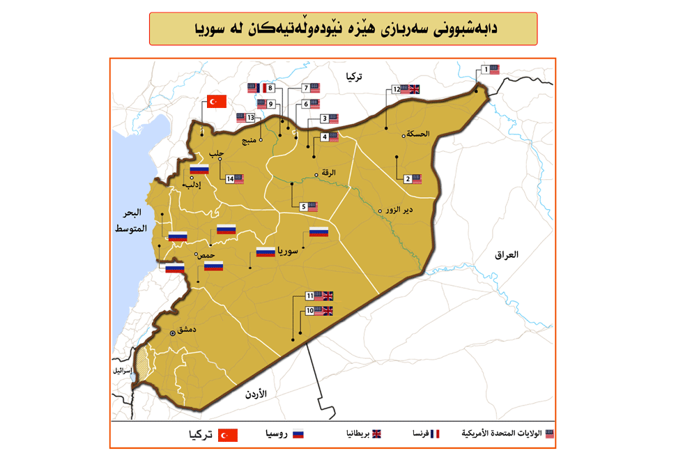 ئەوەی زیاتر بوەتە جێگەی گفتوگۆی میدیا و سیاسییەكان بونی هێزەكانی ئەمریكایە لە سوریا، كە زانیارییەكان ئاماژە بەوە دەكەن كە ئەمریكا ( 2000 ) سەرباز و 10 بنكەی سەربازی و 2 بنكەی ئاسمانی لە سوریا هەیە بەسەر ناوچەكاندا دابەشبوون بەم شێوەیە:.