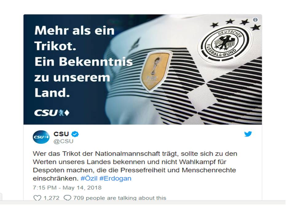 مەسعود ئۆزێل و ئیلكای گۆندۆگان هەردوو یاریزانی هەڵبژاردەی ئەڵمانیا دوای دیدارێكیان لەگەڵ رەجەب تەیب ئەردۆغانی سەرۆكی توركیا لە لەندەن. مشتومڕێكی توندیان لە ئەڵمانیا دروستكردووە، ئەو خەڵاتانەی كە ئەو دوو یاریزانە بەخشییانە ئەردۆغان، جارێكی تر پرسی كێشەی ئینتیمایان لە ئەڵمانیا هێنایەوە بەر باس و خواس.