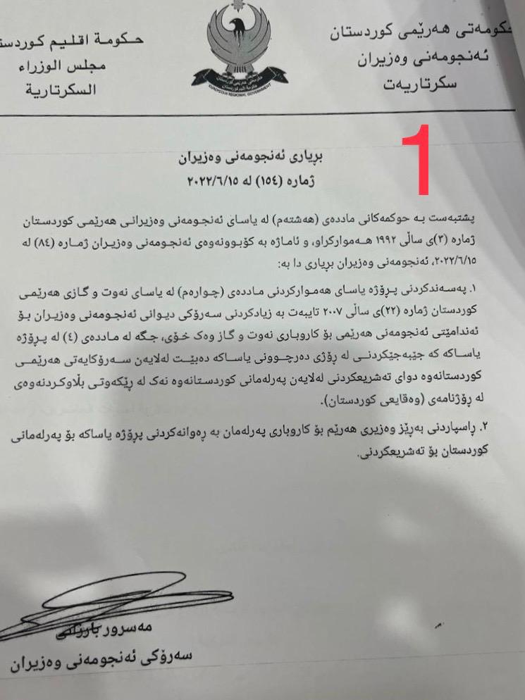 بەڵام نوسراوێکی ئەنجومەنی وەزیران، کە رێکەوتی ١٥ی ٦ی ٢٠٢٢ و واژۆی مەسرور بارزانی لە سەرە، ئاماژە بەوە دەکات لە ئەنجومەنی وەزیراندا پرۆژە یاسایەک پەسەند کراوە، کە مەبەست لێی هەموارکردنەوەی مادەی (٤)ی یاسای نەوت و گازە، بە جۆرێک ژمارەی ئەندامانی ئەنجومەنی هەرێمی لە پێنج کەسەوە بکرێن بە شەش، ئەمەش بە زیادکردنی (سەرۆکی دیوانی ئەنجومەنی وەزیران) بۆ ئەنجومەنی هەرێمییەکە.