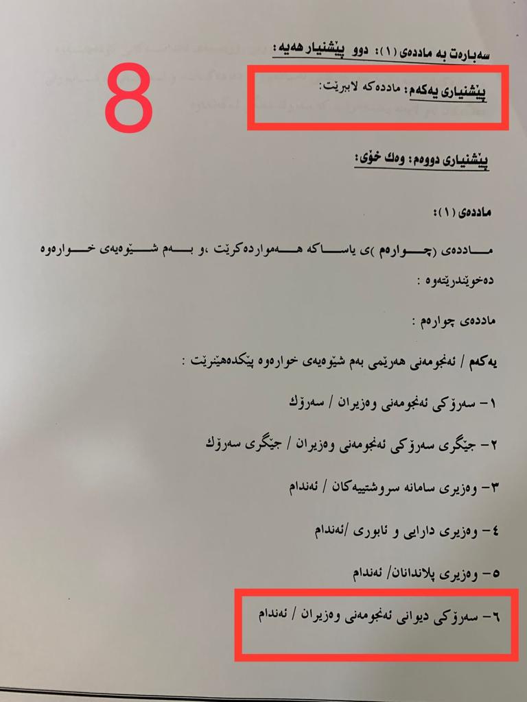 یەک: سەرۆکی دیوانی ئەنجومەنی وەزیران، کە زیاد دەکرێ بۆ ئەنجومەنی هەرێمی، لە ئێستادا (ئومێد سەباح)ە کە پارتییە، بەم هەموارە ژمارەی ئەندامانی پارتی لە ئەنجومەنەکەدا لە دوو کەسەوە دەبن بە سێ، بەمەش نیوەی تەواوی ئەنجومەنەکە دەبنە نوێنەرانی پارتی، نیوەکەی تریشی گۆڕان و یەکێتی.