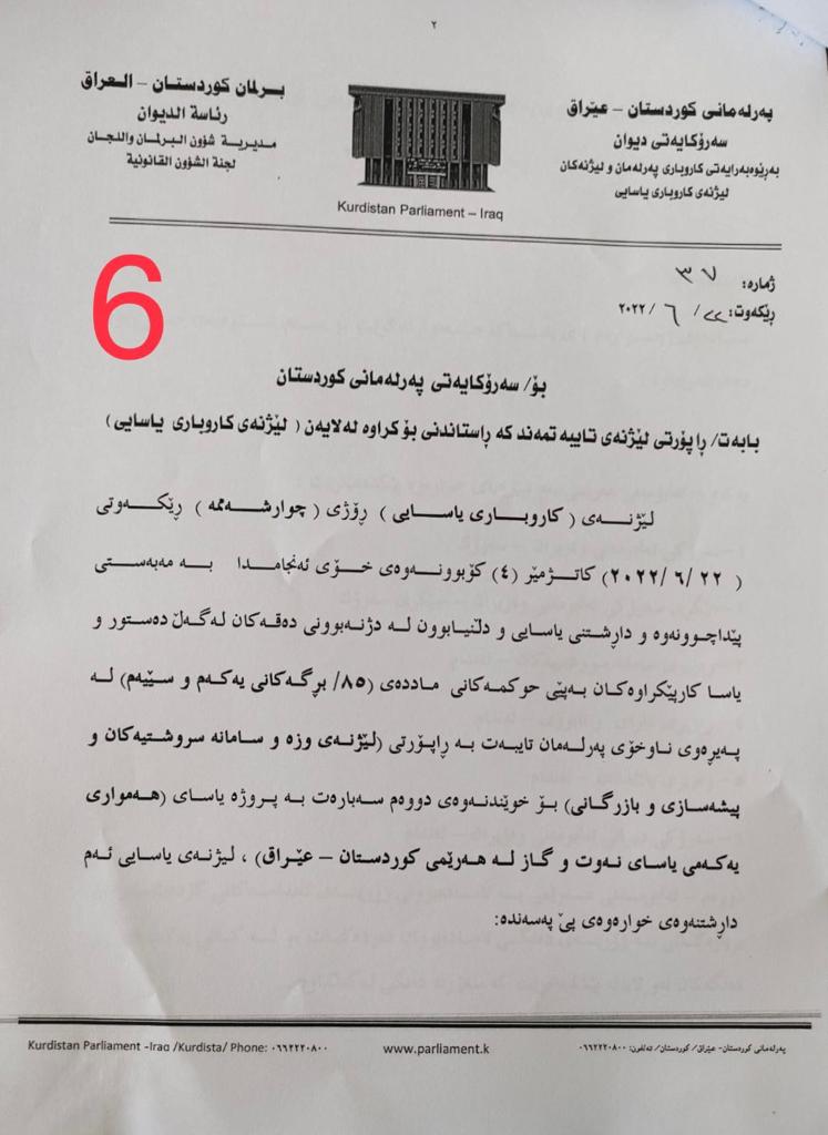 ئەم کەینوبەینەی لیژنەی یاساییش هەر کەمتر لە ٤٠ خولەکێکی پێچووبوو، دوای کۆبونەوەکەیان سەرۆکی لیژنەکە راستەوخۆ بە نوسراوی ژمارە (٢٧)ی رێکەوتی ٢٢ی ٦ی ٢٠٢٢، راپۆرتە راستێندراوەکە ئاڕاستەی سەرۆکایەتی پەرلەمان دەکاتەوە.