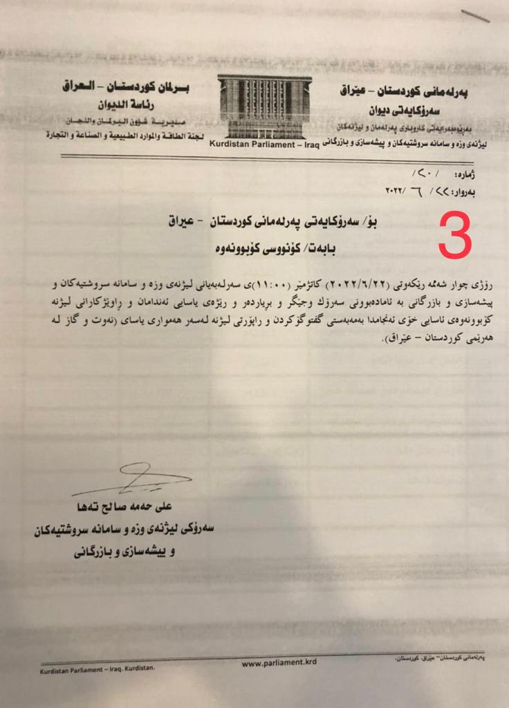 وەڵامی پرسیارەکان لێرەیە؛ بە پێی نوسراوی ژمارە (٢٠) کە رێکەوتی ٢٢ی ٦ی ٢٠٢٢ و واژۆی سەرۆکی لیژنەی سامانە سروشتیەکان (عەلی حەمە ساڵح)ی لە سەرەو ئاڕاستەی سەرۆکایەتی پەرلەمان کراوە؛ لەم نوسراوەدا کە تەنها یەک پەڕەیە و هەم نوسراوی فەرمی سەرۆکی لیژنەکەیە و هەم دەقی راپۆرتەکەشە، تێیدا هاتووە: مادەی چوارەم (وەک خۆی)!، واتە پرۆژەکەی حکومەت کتومت وەک ئەوەی بۆ پەرلەمانیان ناردبوو لە لیژنەی سامانە سروشتیەکاندا پەسەند دەکرێت! رونتر کۆی راپۆرتەکەی ئەم لیژنەیە لە (دوو وشە) پێکدێت، کە بریتین لە (وەک خۆی)!