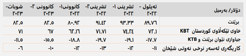 ئەم خشتەیەی خوارەوە کورتەیەک لە زانیارییەکانی نرخادن بۆ نەوتی هەرێم KBT کە لەلایەن حکومەتی هەرێمەوە بڵاوکراوەتەوە بۆ مانگەکانی ئەیلوولی ٢٠٢٢ تا ١ی ٢٠٢٣، لەوانەش کاریگەری لەسەر نرخە بەدەست هێنراوەکانی شێخان لە بەرامبەر میکانیزمی پێشووی نرخاندن: