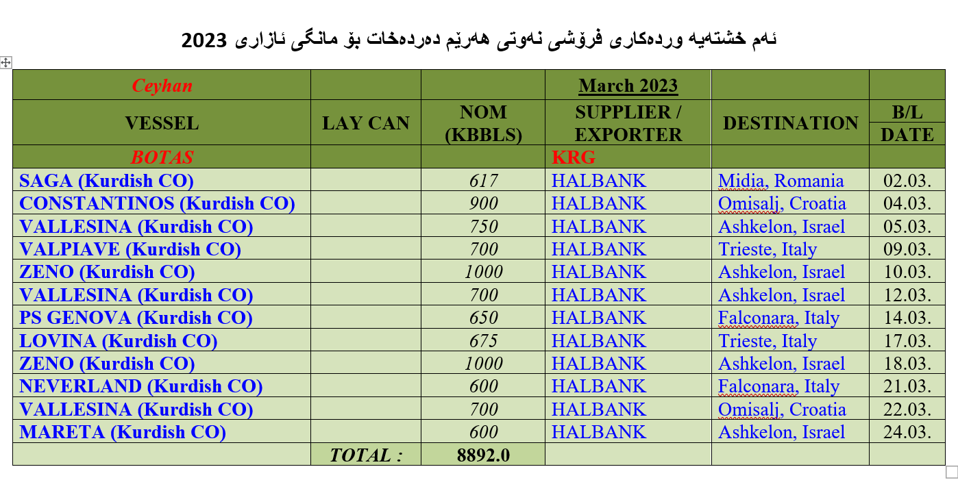 • لە مانگی ئازاری (2023)دا لە رۆژی (24/3/2023) دواین کەشتی نەوتی هەرێمی کوردستان لە بەندەرەی جەیهانی تورکی بارکراوە، بەو پێیە تا ئەو ڕێکەوتە هەرێم بڕی (8 ملیۆن و 892 هەزار) بەرمیل نەوتی هەناردەکردوە لە ڕێگای بەندەری جیهانی تورکیاوە.