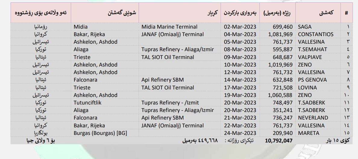 لە مانگی ئازاری ٢٠٢٣دا، بڕی نەوتی بارکراو لە بەندەری جەیهانی تورکیا تا سەرلەبەیانی رۆژی ٢٥ی ئازار بارکراوە تەنها لە ١٥ کەشتی قەبارەجیا دا کە بۆ ٦وڵاتی جیا ڕۆشتووە بریتی بووە لە ١٠،٧٩٢،٠٤٧ بەرمیل نەوت، کە بەتێکڕا رۆژانە ٤٤٩,٦٦٨ بەرمیل نەوتی رۆژانە بووە. زانیاری ناو وە ژمارەی ئەو کەشتیانەی نەوتی عێراقیان ( هەرێم و کەرکوک) بارکردووە ، لەگەڵ بەروار و بڕی نەوتی بارکراو لە هەرکەشتییەکدا و ناوی ئەوکۆمپانیایانەی نەوتی هەرێمیان کڕیوە و بۆ چ وڵاتێک ڕۆشتووە.