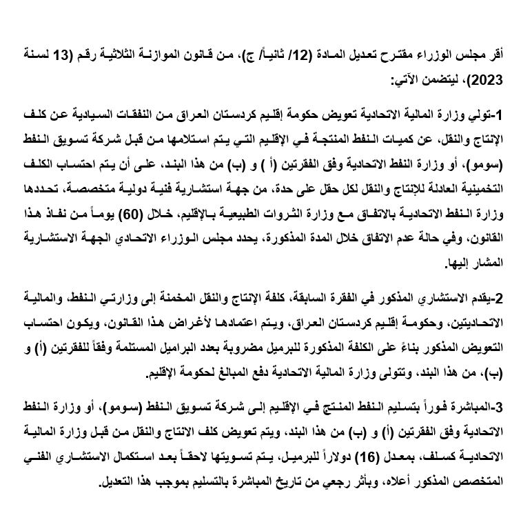 ئەنجومەنی وەزیرانی عێراق لە كۆبونەوەی ئەمڕۆیدا، پێشنیازی هەمواری مادەی (12/دووەم/ج)ی لە یاسای بودجەی سێ ساڵی ژمارە (13ی ساڵی 2023) پەسەندكرد، كە ئەمانەی خوارەوە لەخۆدەگرێت: