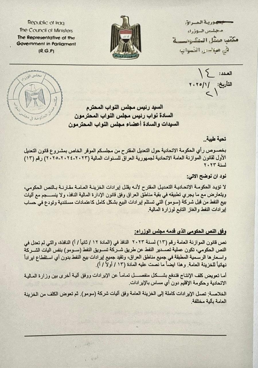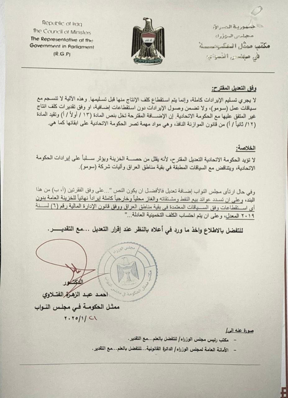 "حكومەتی فیدراڵی پشتیوانی هەمواری پێشنیازكراو ناكات، چونكە داهاتەكانی خەزێنەی گشتی كەمدەكاتەوە بەراورد بە دەقی حكومی، پێچەوانەی ئەوەشە كە جێبەجێدەكرێت لە ناوچەكانی تری عێراق بەگوێرەی یاسای ئیدارەی دارایی بەركار و، ناگونجێت لەگەڵ میكانیزمەكانی فرۆشتنی نەوت لەلایەن كۆمپانیای سۆمۆوە، كە تەواوی داهاتەكانی رادەستی هەژماری نەوت و غازی سەربە وەزارەتی دارایی دەكات.