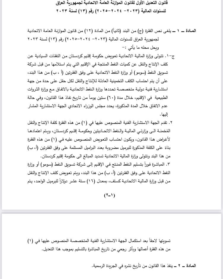 دەقی هەمواری یاسای بودجەی عێراق سەبارەت بە تێچووی بەرهەمهێنانی نەوت لە كوردستان: