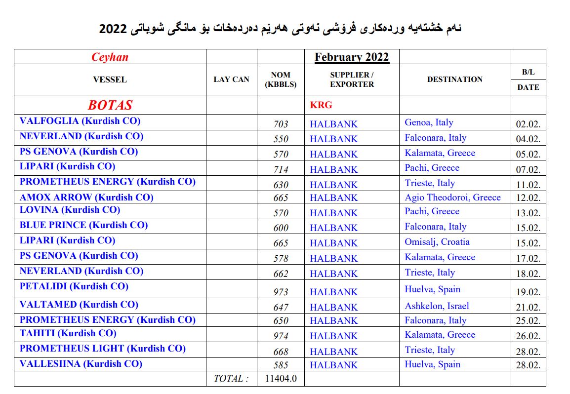 • هەرێمی کوردستان لە مانگی شوباتی (2022)دا بڕی (11 ملیۆن و 404 هەزار) بەرمیل نەوتی هەناردەکردوە لە ڕێگای بەندەری جیهانی تورکیاوە كە رۆژانە بۆ 28 رۆژی مانگی شوبات دەكاتە ( 407 هەزارو 285) بەرمیل.