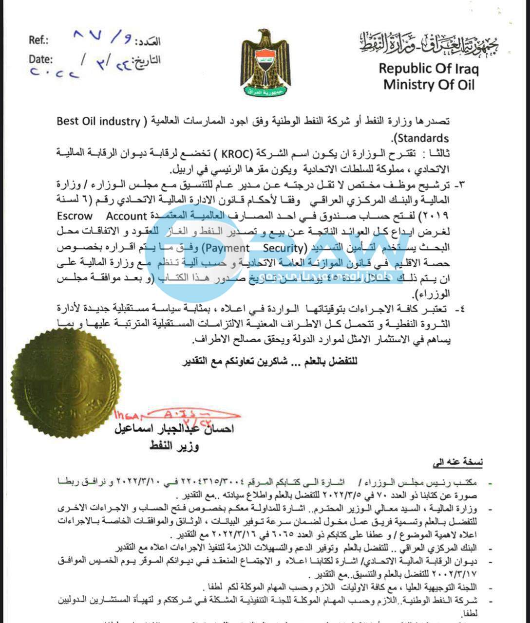 وەزارەتی نەوتی عێراق لەبەر رۆشنایی بڕیاری دادگای فیدڕالیدا، نوسراوێکی دەرکردووەو داوای دروستکردنی کۆمپانیایەک دەکات بۆ بەڕێوەبردنی دۆسیەی نەوت و غازی ھەرێمی کوردستان، کۆمپانیاکە سەربە حکومەتی ناوەند دەبێت و ناوی لێنراوە (KROC)و بارەگا سەرەکییەکەی لە ھەولێر دەبێت.
