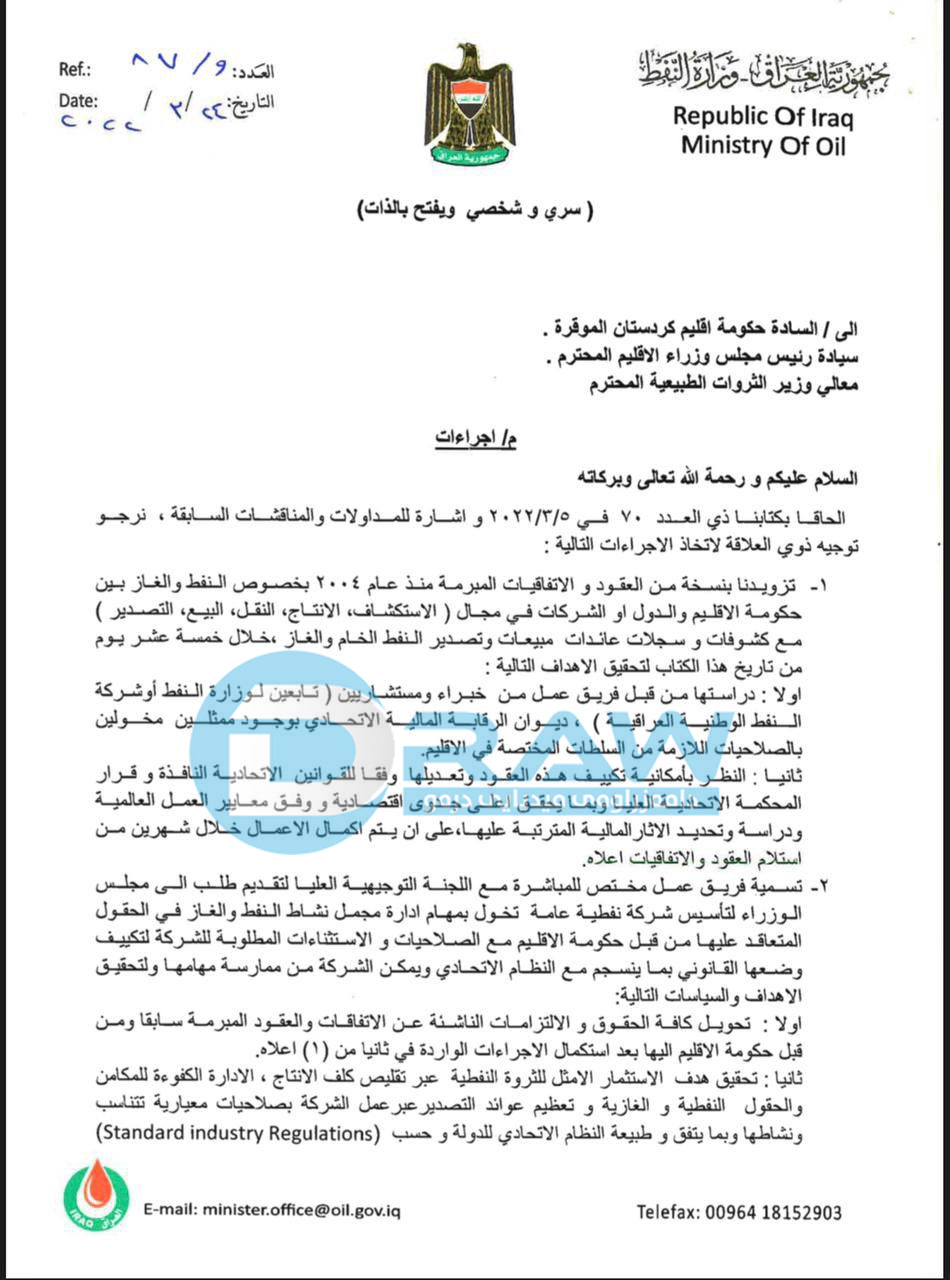 بەپێی نوسراوێک کە رۆژی ٢٤ی ئەم مانگە، وەزارەتی نەوتی عێراق ئاڕاستەی حکومەتی ھەرێمی کوردستانی کردووە، داوا کراوە حکومەتی ھەرێم: