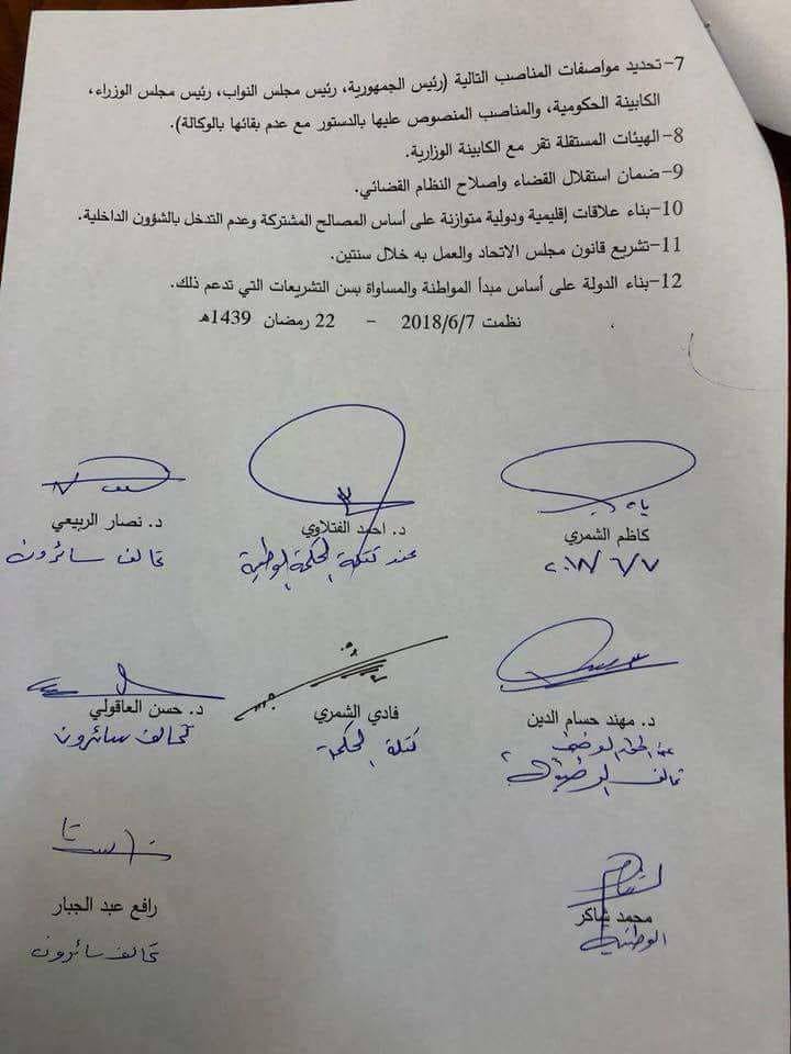 هاوپەیمانێتی سائرونی موقتەدا سەدر و هاوپەیمانی نیشتمانی ئەیاد عەلاویی و رەوتی حیكمەی نیشتمانی عەممار حەكیم رێككەوتنێكیان بۆ پێكهێنانی هاوپەیمانێتی زۆرینەی نیشتمانی بۆ دوای قۆناغەكانی هەڵبژاردنی 2018 ئیمزاكرد.