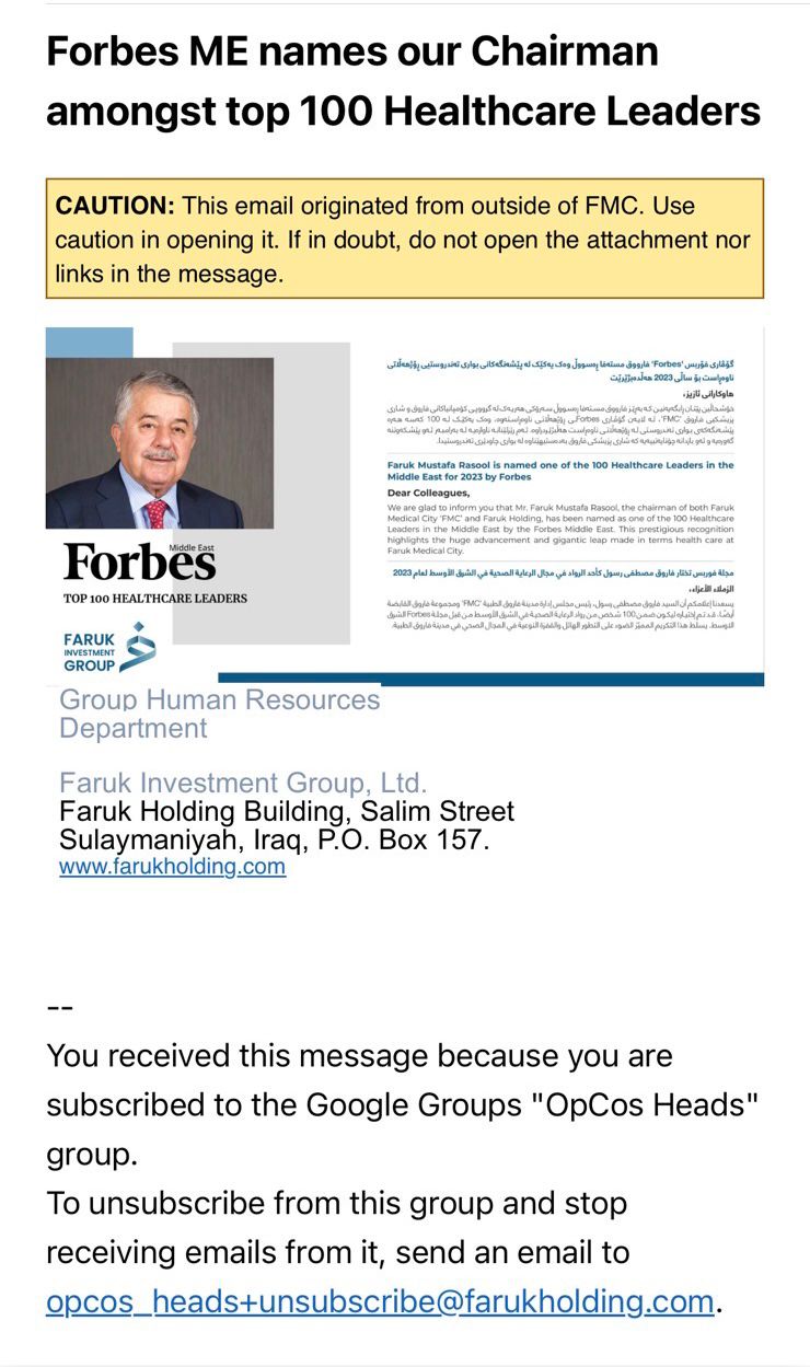 گۆڤاری فۆربێسی (Forbes) رۆژهەڵاتی ناوەڕاست ساڵانە (100) كەس دیاریدەكات كە لە كەرتی تەندروستیدا پێشەنگ بوون، ئەو (100) كەسە كاریگەرییان لە بواری خزمەتكردنی تەندروستیدا هەبووە، توانیویانە پێشكەوتنی گەورە پێشكەش بە بواری تەندروستی بكەن، بۆ ساڵی 2023 لە لیستەكەدا (فارو ق مەلا مستەفا) سەرمایەداری كوردی تێدایە، وەك خاوەنی شاری پزیشكی فاروق كە توانیوێتی خزمەتگوزاری لە بواری چاودێری تەندروستیدا لە عێراق پێشكەش بكات.