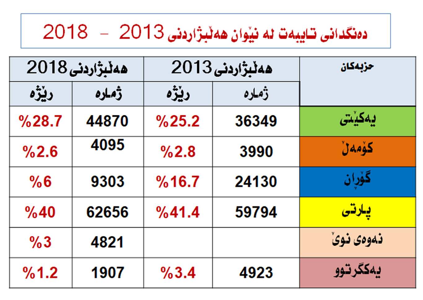 بەبەراورد بە هەڵبژاردنی 12ی ئایار دەنگی یەكێتی و پارتی كەمیكردووەو بەراورد بە 2013 زیادیانكردووە