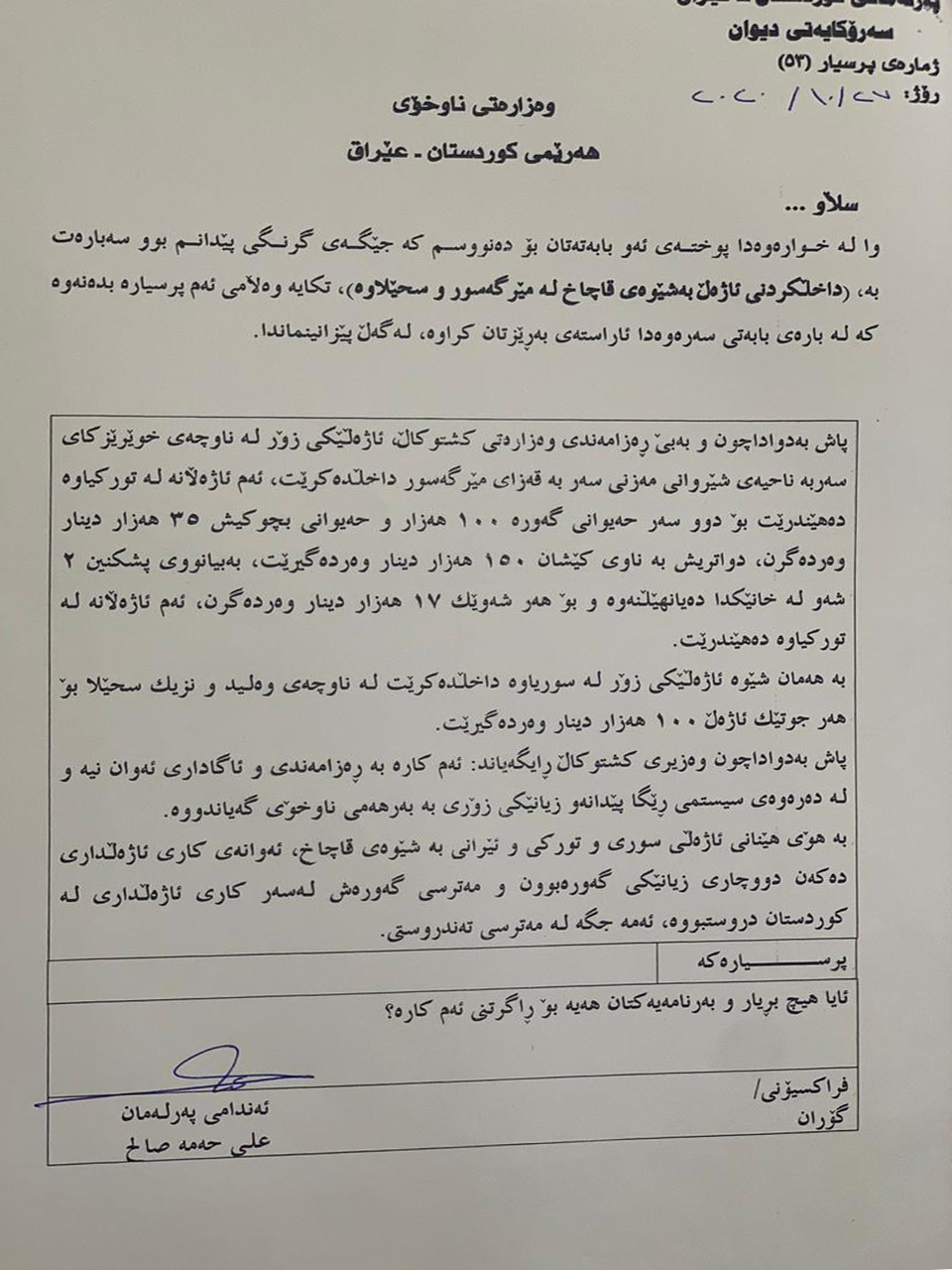 بەپێی نوسراوێک عەلی حەمەساڵح ئەندامی پەرلەمان کوردستان کە مانگی رابردوو ئاڕاستەی وەزارەتی ناوخۆی کردووەو کۆپییەکی دەست (درەو) کەوتووە: