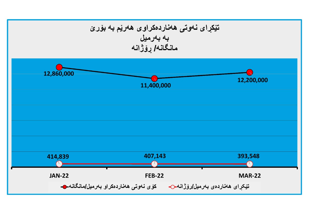 لە مانگی کانونی دووەمی ساڵی (2022) ڕۆژانە بڕی (414 هەزار و 839) بەرمیل نەوتی هەناردە کردووە بە کۆی مانگەکە (12 ملیۆن و 860 هەزار) بەرمیل بووە.