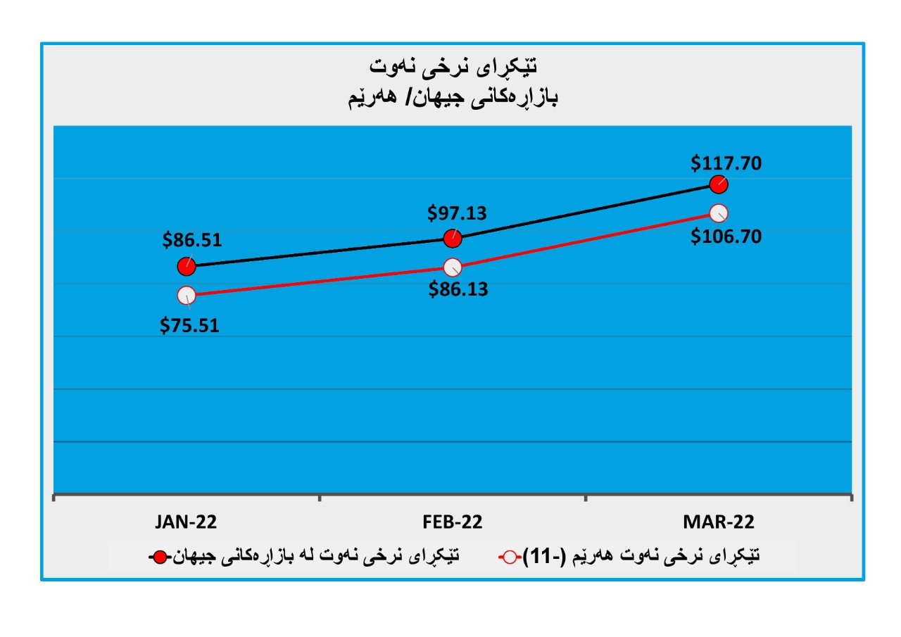 لە کاتێکدا لە مانگی ئازاردا بەرزبوونەوەی بەرچاو تۆمار کراوە و نرخی نەوت بە تێکڕا گەیشتووە بە (117.7) دۆلار، بۆ دەکرێت بڵێین حکومەتی هەرێم هەر بەرمیلە نەوتێکی بە زیاتر لە (106) دۆلار فرۆشتووە. (بڕوانە خشتەی ژمارە (1) و چارتی ژمارە (2))