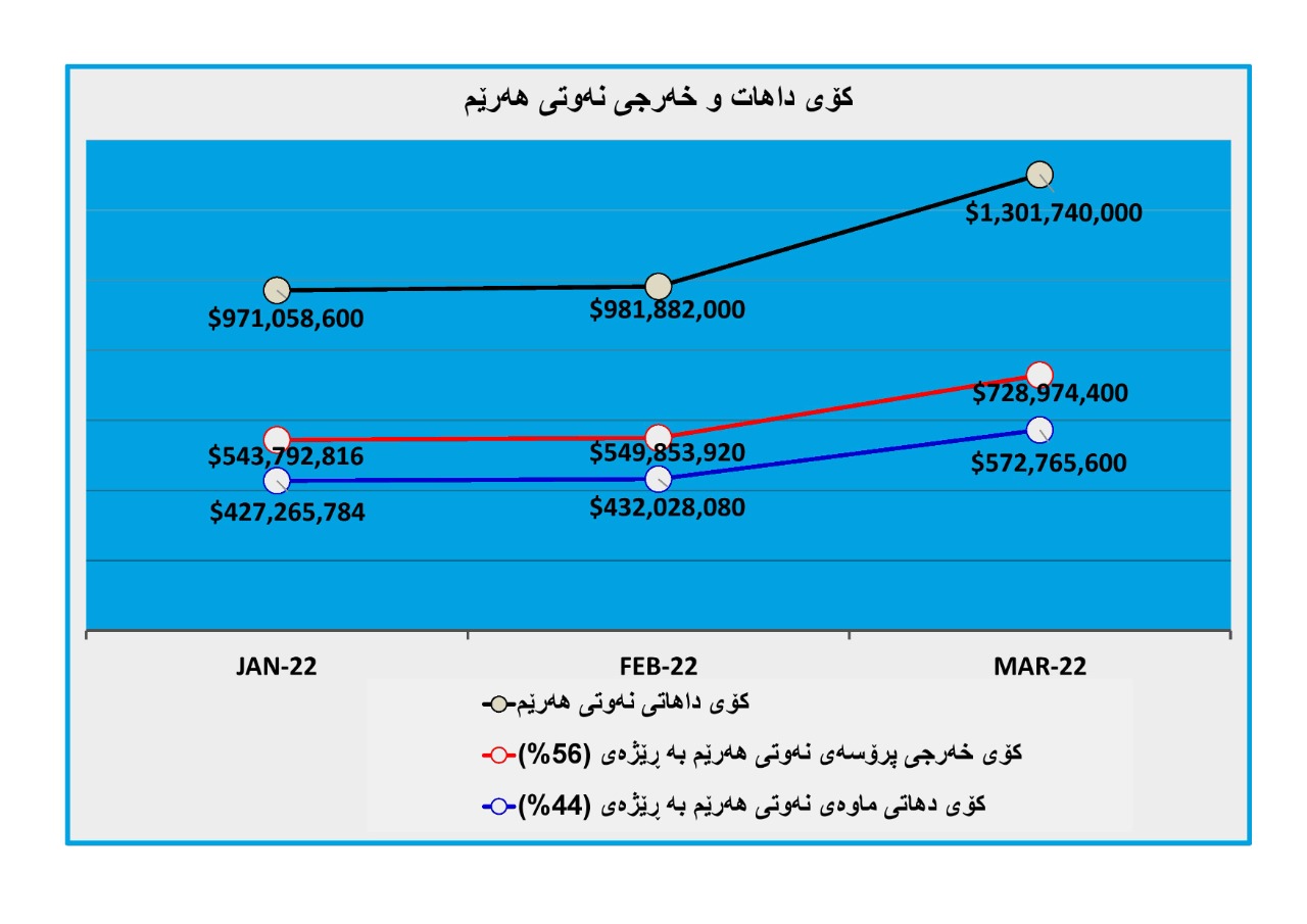 لە مانگی ئازاردا کە کۆی داهاتی نەوت بریتی بووە لە (ملیارێک و 301 ملیۆن و 740 هەزار) دۆلار، بڕی (728 ملیۆن و 974 هەزار و 400) دۆلاری چووە بۆ خەرجی بە ڕێژەی (56%).