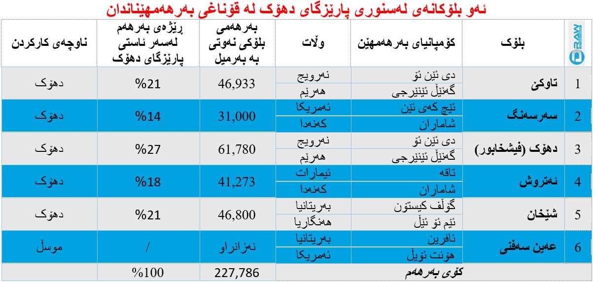 15. بلۆكی ڕوڤیا: لە پارێزگای دهۆک، سهروی قهزای بهردهڕهش و خواروی ئاكرێ دهگرێتهوه و ڕووبهرهكهی (517) كیلۆمهتر دووجایه و بەپێی زانیارییەکان بڕی (1) ملیار بهرمیل نهوتی تێدایه. (شیفرۆن)ی ئهمریكی پشكی (60%)ی كڕیوه له كۆمپانیای (ڕایهڵانس ئیندستریس)ی هندی و (15%)ی پشكی (ئۆ ئێم ڤی) نهمساوی و (25%)ی پشكی (كیپكۆ)ی حکومەتی هەرێم کوردستانە.