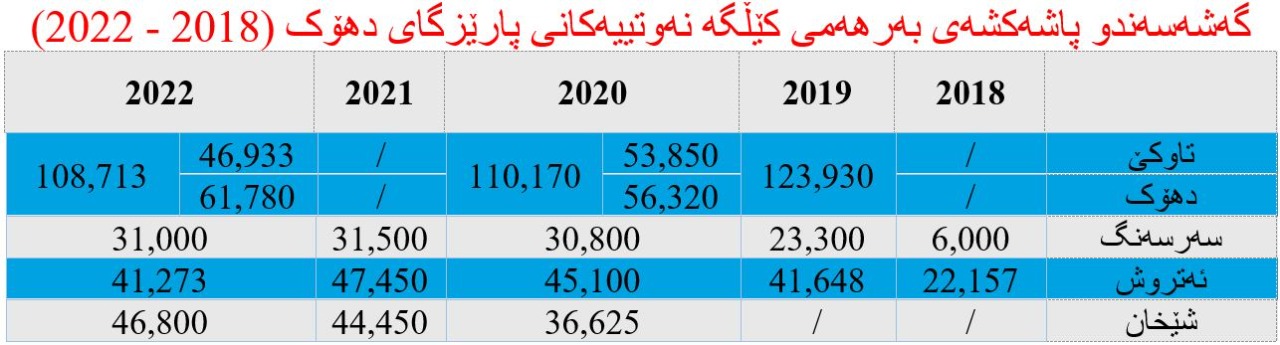 بەپێی داتاکانی ساڵی ٢٠٢٠ بەراورد بە ساڵی ٢٠٢٢ لە (6) کێڵگە بەرهەمێنەکەی پارێزگای دهۆک سێ کێڵگەی (فیشخابور (دهۆک)، سەرسەنگ و شێخان) بەرهەمی نەوتی ڕۆژانەیان بەرزبووتەوەو لە دوو کێڵگە (تاوکێ و ئەتروش) بڕی بەرهەمیان دابەزیوەو هیچ زانیارییەکیش دەربارەی بەرهەمی بلۆکی (عەین سەفنی) بەردەست نیە. (بڕوانە خشتەی ژمارە (٣))