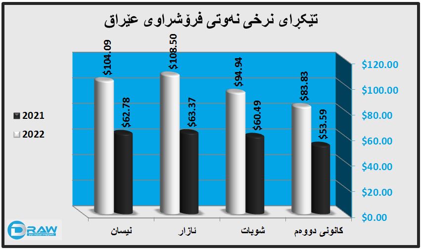 بەڵام لە چوار مانگی یەکەمی (2022) بە تێکڕا بەرمیلێک نەوتی عێراق بە (97.84) دۆلار فرۆشراوە.