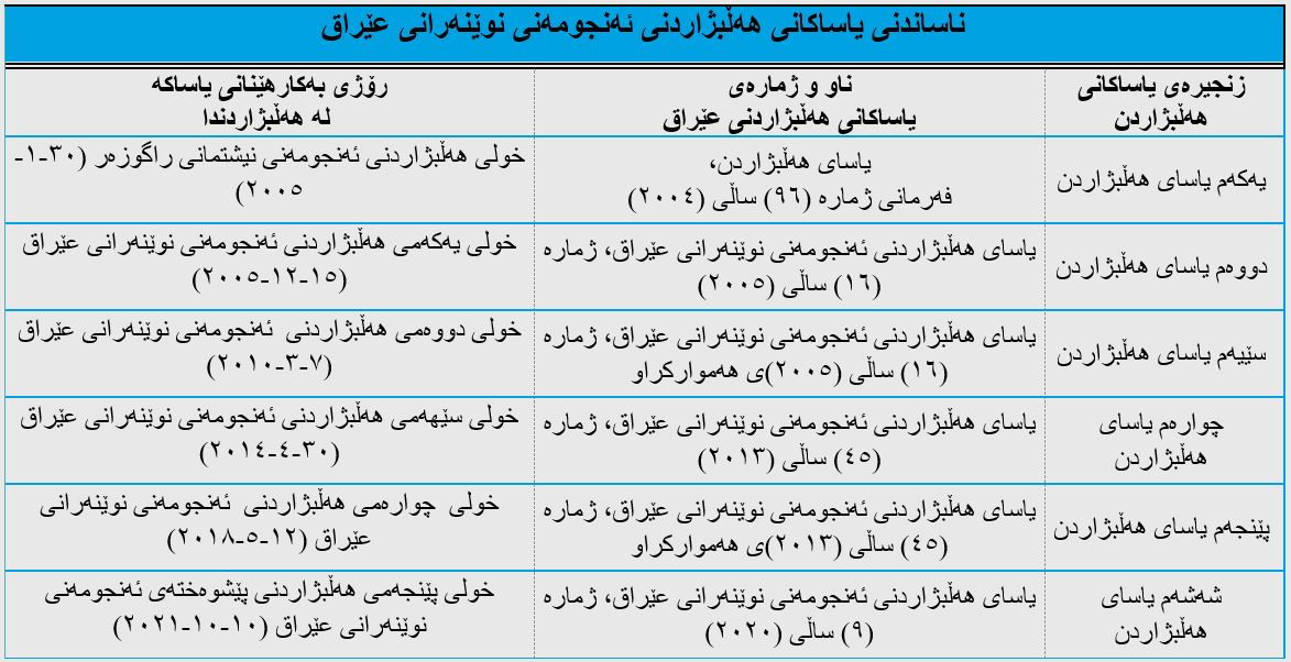 • یاساکانی هەڵبژاردنی ئەنجومەنی نوێنەرانی عێراق سەقامگیریی تەشریعیان تێدا نییە و بە ئەندازەی ژمارەی هەڵبژاردنە ئەنجامدراوەکان یاسای هەڵبژاردنیش هەموارکراوەتەوە و دەرچووە.