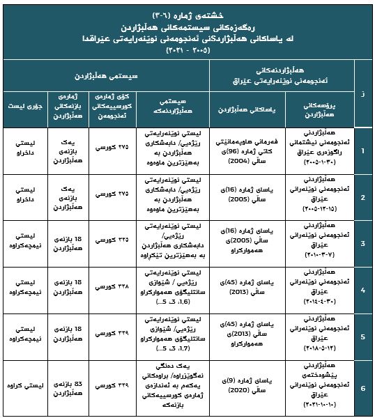 بەر لەو شرۆڤەیە، هەوڵدەدەین لە رێگەی خشتەی ژمارە (٦-٣)وە زانیاری لەبارەی هەریەک لە یاساکانی هەڵبژاردن و سیستمەکانی هەڵبژاردن و کۆی ژمارەی کورسییەکانی ئەنجومەنی نوێنەرانی عێراق و ژمارەی بازنەکانی هەڵبژاردن و جۆری ئەو لیستە دەخەینەڕوو، کە لە شەش هەڵبژاردنی رابوردودا هەبوون.