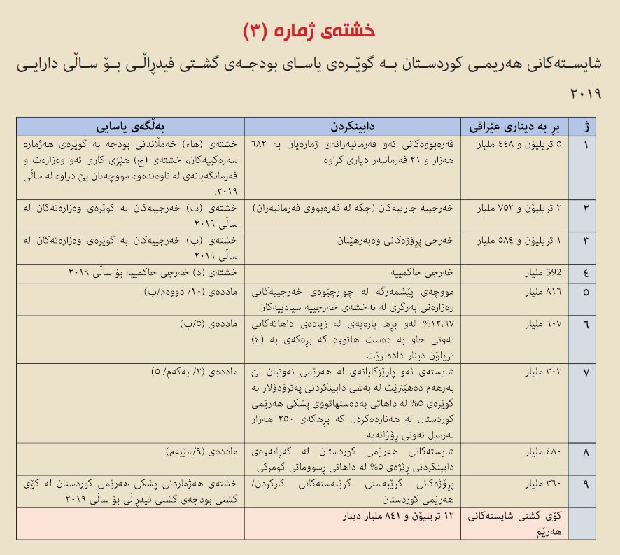 3- خشتهی ژماره (3) شایستهكانی ههریمی كوردستان به گوێرهی یاسای بودجهی گشتی فیدڕاڵی بۆ ساڵی دارایی 2019.