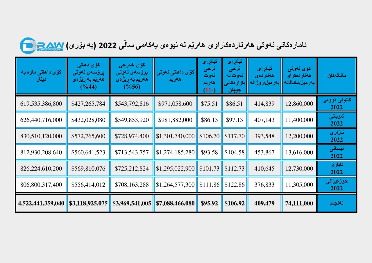 حکومەتی هەرێمی کوردستان لە نیوەی یەکەمی ساڵی (2022) بڕی (74 ملیۆن و 111 هەزار) بەرمیل نەوتی هەناردە کردووە، بە تێکڕا هەر بەرمیلێک نەوتێکی بە نزیکەی (96) دۆلار فرۆشتووە، لە کاتێکدا تێکڕای نرخی بەرمیلێک نەوت لەو ماوەیەدا نزیکەی لە (106) دۆلار بووە، بۆیە کۆی ئەو داهاتەی لە ڕێگەی فرۆشتنی نەوتەوە بە بۆری بەدەستهاتووە بریتی بووە لە (7 ملیار و 88 ملیۆن و 466 هەزار و 80) دۆلار. (بڕوانە خشتەی ژمارە (1) و چارتی ژمارە (3)) بە جۆرێک؛